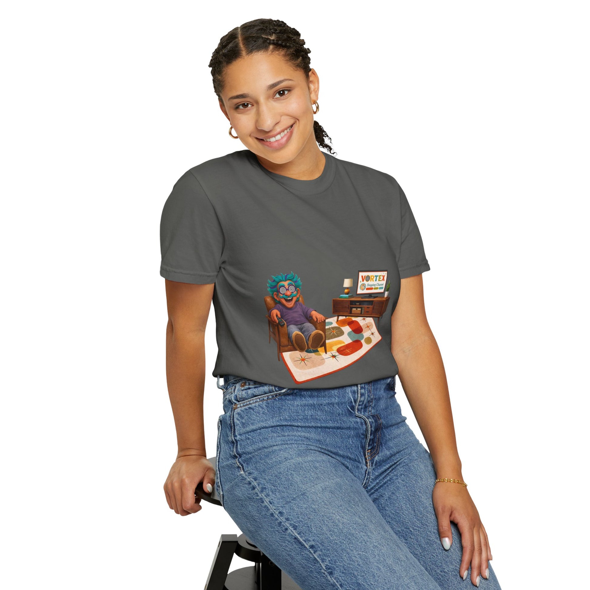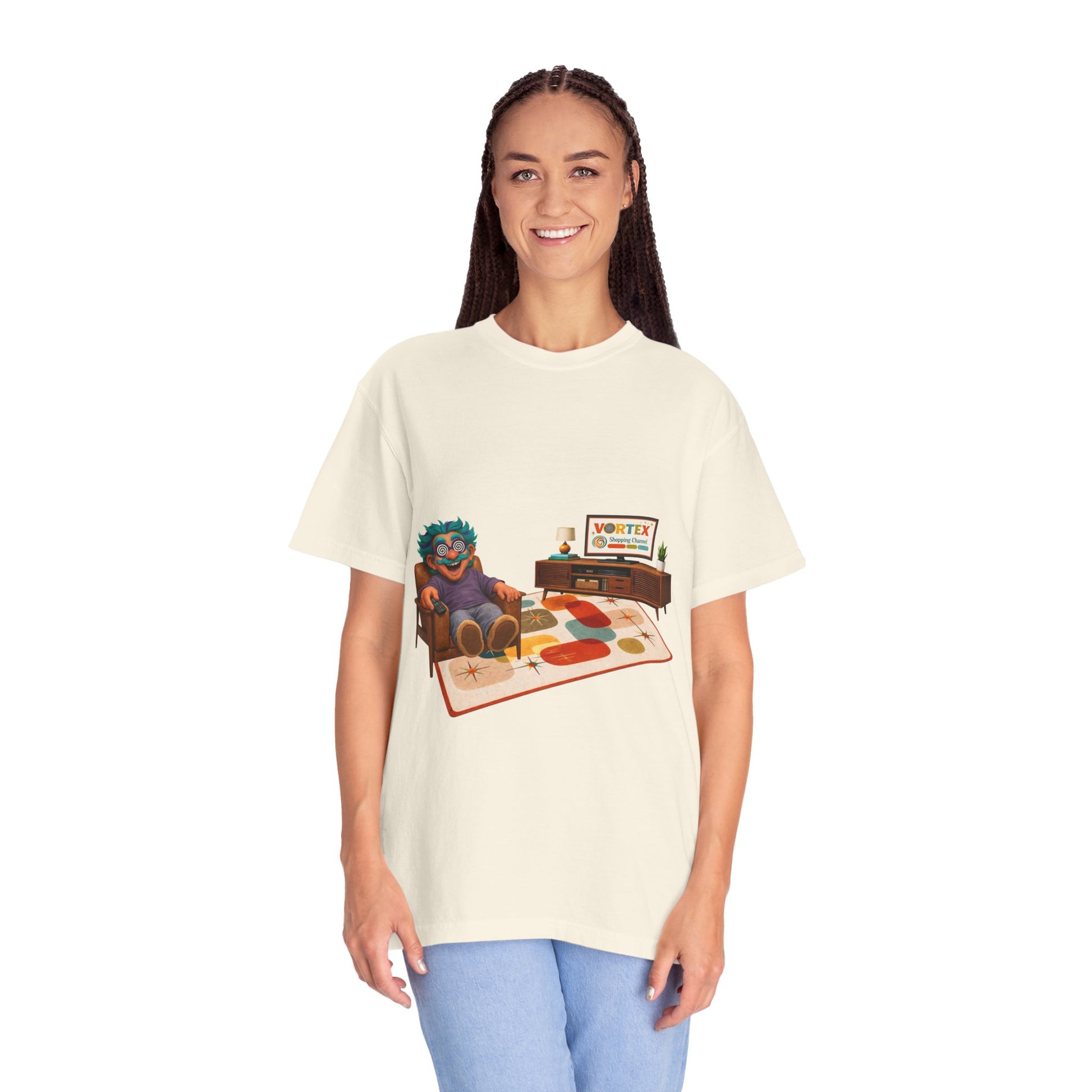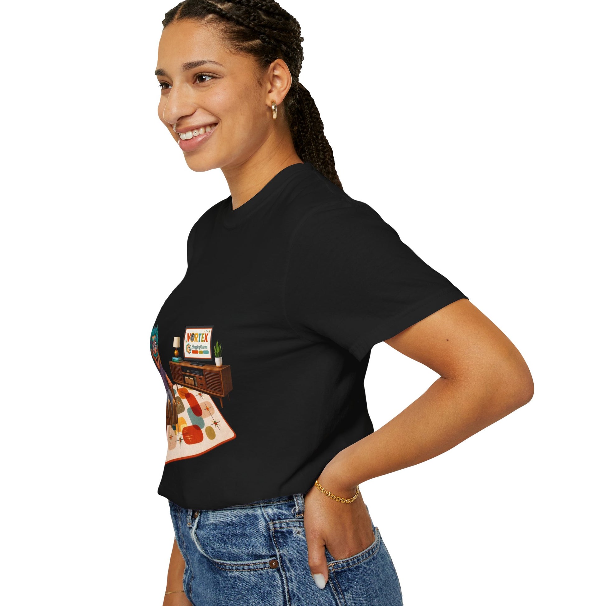 Vintage Living Room Graphic T-Shirt — 'VORTEX' Retro Gamer Chill Tee